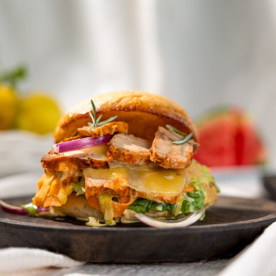 Kyllingburger med mørke surdeigsbrød