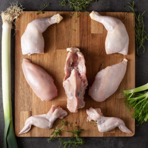 Hel kylling stykket opp før steking, på en seng av rotgrønnsaker