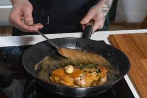 Vend på pannen så smøret samler seg i bunnen, og øs smøret over kyllingen i flere omganger for å fullføre tilberedelsen.